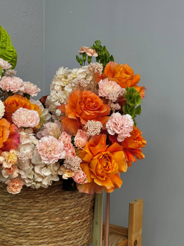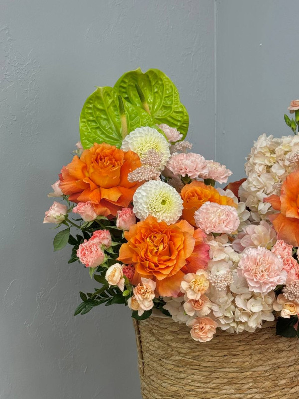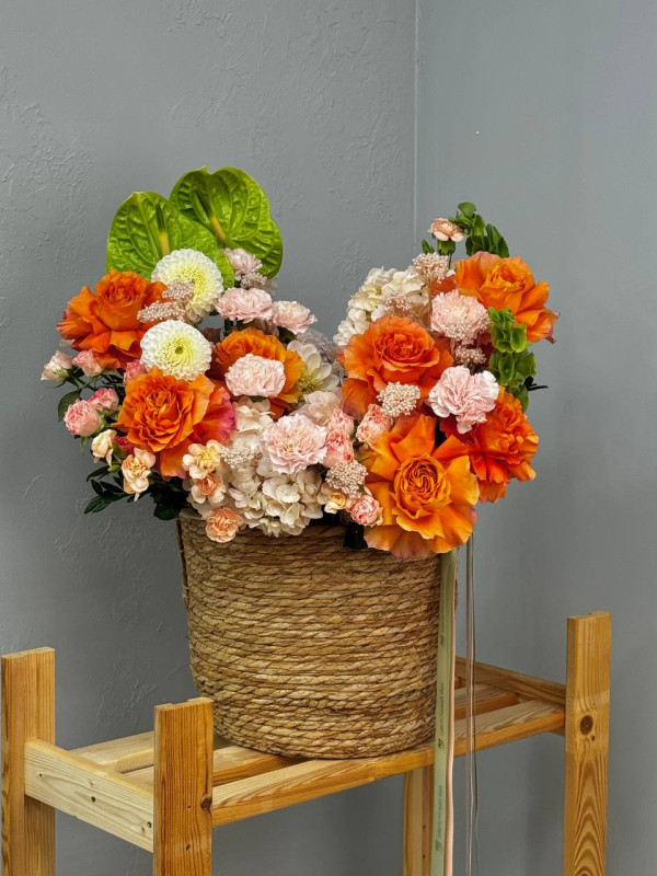 Представляем яркий и сочный букет в элегантной корзине - настоящий взрыв ароматов! В его составе - пышная кустовая роза, нежная гортензия и яркая оранжевая французская роза, которые создают насыщенную цветовую палитру. Экзотический антуриум привносит изысканную тропическую нотку и утонченную форму, дополняя общую композицию. А живые гвоздики и крупные георгины придают букета объем и текстуру, делая его по-настоящему роскошным. Этот букет - идеальное сочетание классики и экзотики, которое подарит радость и подчеркнёт особый повод.
