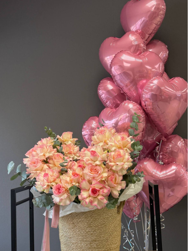 Роскошная корзина из 35 французских роз с дополнением из 15 фольгированных шаров в форме сердца - идеальный способ выразить самые искренние чувства. Прекрасный выбор для признания в любви, годовщины или особенного сюрприза.