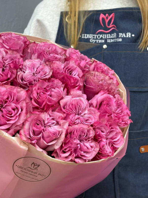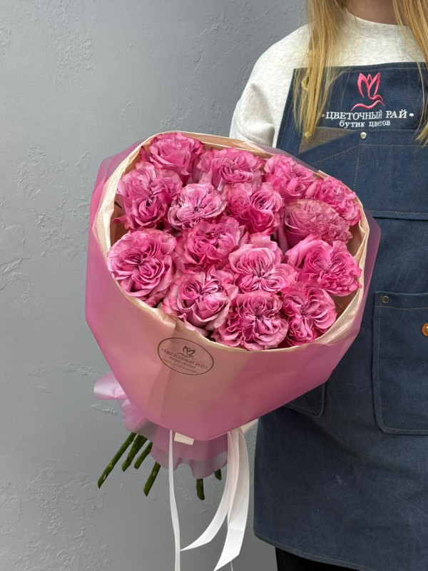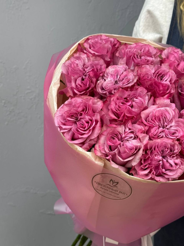 Букет из 15 сиреневых пионовидных роз 60 см. Великолепное моно из пионовидных роз, с утонченным ароматом, придают атмосферу романтики. Идеальный подарок что бы порадовать близкого человека, по любому поводу и без.