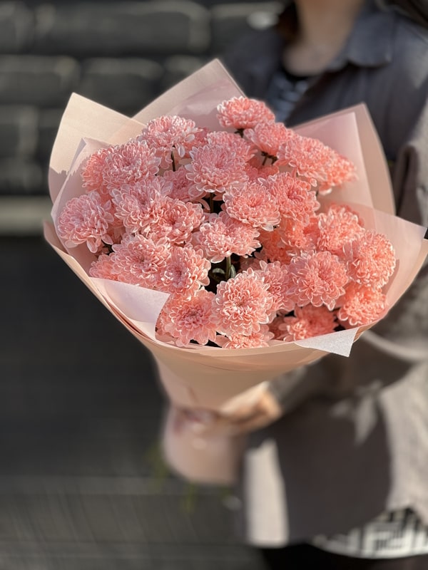 Букет из 7 кустовых хризантем в упаковке. Возможна замена цвета, либо микс.