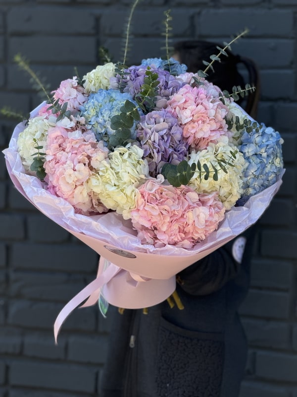 Роскошный букет из 15 пышных, разноцветных гортензий с добавлением ароматного эвкалипта, точно станет лучшим дополнением для любого праздника вашего близкого человека.