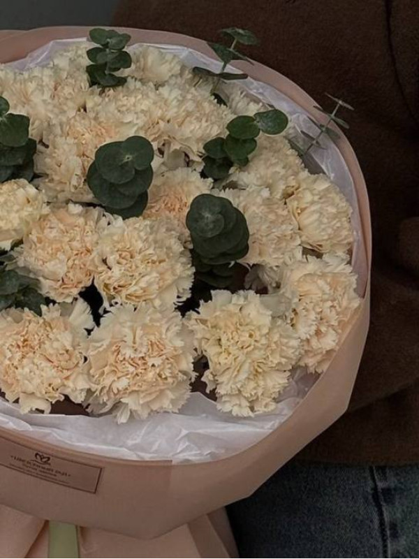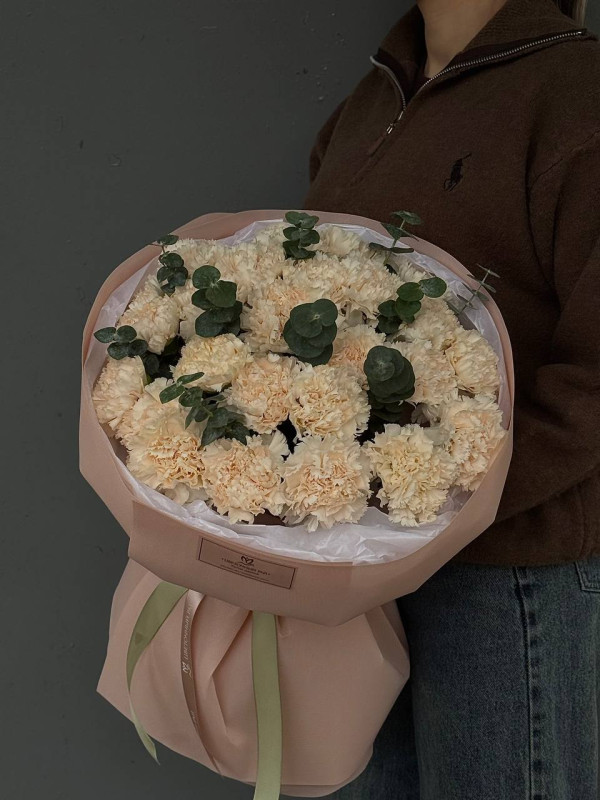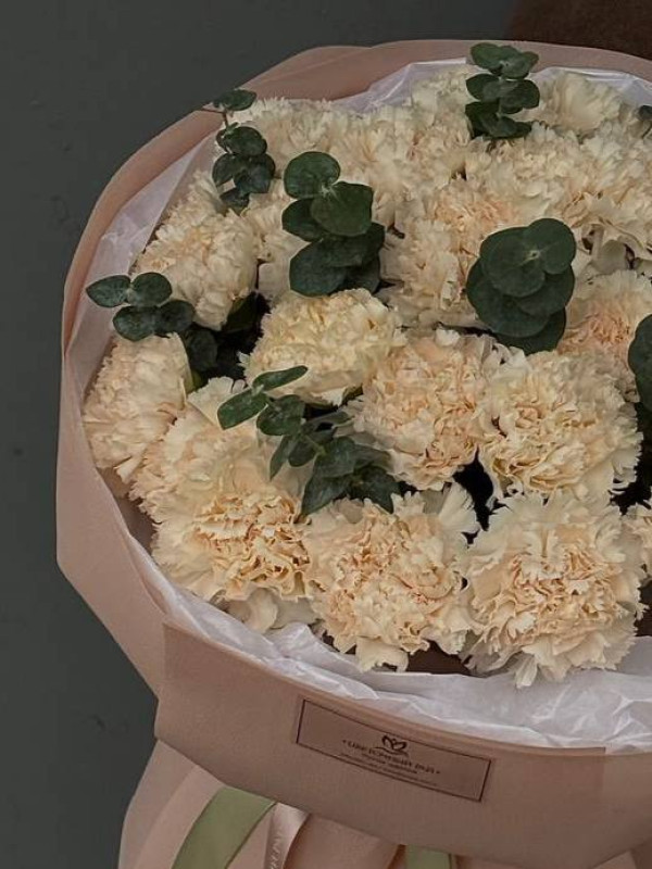 Моно букет из стойких гвоздик с добавлением зелени белых в лаконичной круглой упаковке. Чистый, изящный, универсальный и стойкий. Подходит как для романтичного повода, так и в знак искренней благодарности.