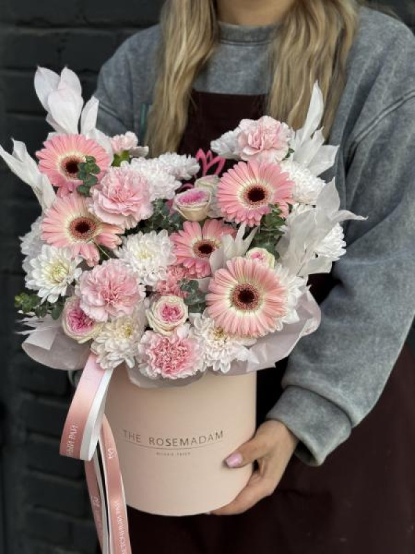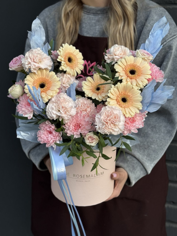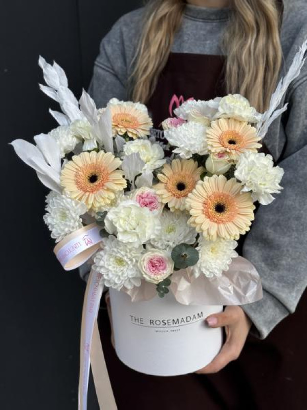 Композиция в коробке с нежными герберами, кустовой хризантемой и кустовой розой. Лёгкость гербер, нежность кустовой розы и пышность хризантемы в обрамлении стабилизированного рускуса - изящный акцент для любого повода.