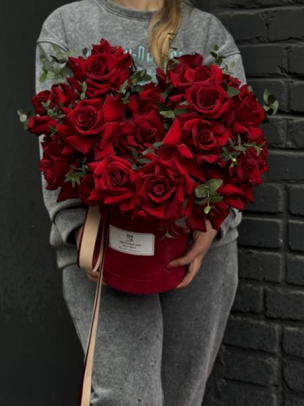 Праздничная и элегантная композиция в стильной коробке, полностью наполненная страстью и нежностью. В центре внимания - изящные красные французские розы, символизирующие глубокую любовь и признание. Их насыщенные, выразительные лепестки создают ощущение гармонии и утонченности. Дополняет композицию изумрудный эвкалипт, подчеркивающий изысканность цветочной палитры. Идеальный подарок для тех, кто ценит классическую элегантность и хочет выразить свои самые искренние чувства.