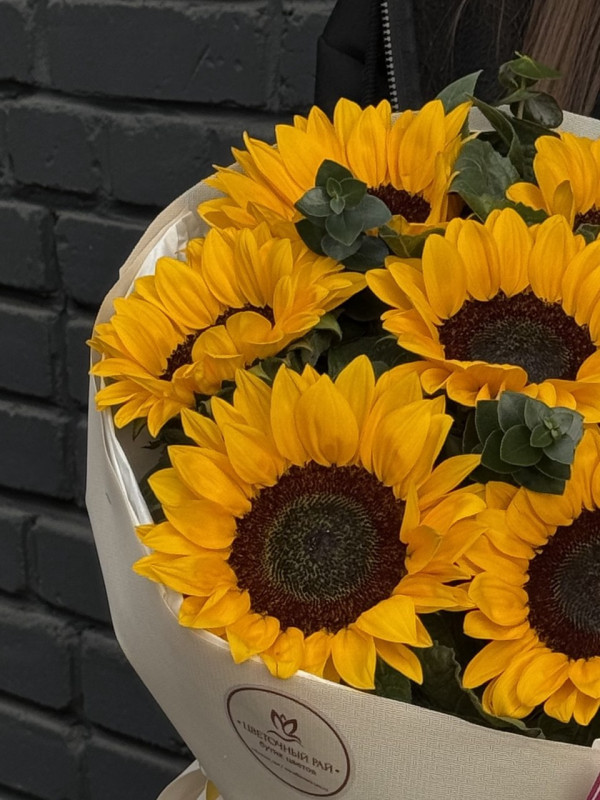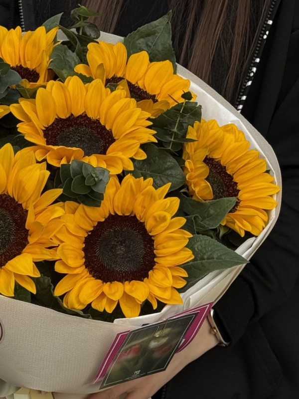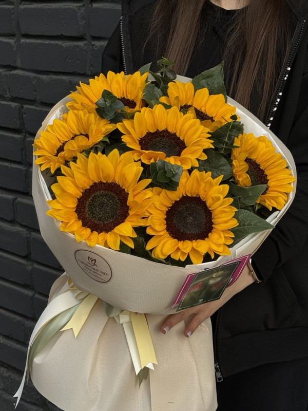 Этот букет из подсолнухов наполняет пространство светом, теплом и летним настроением. Яркие желтые лепестки, словно солнечные лучи, дарят радость с первого взгляда. Идеальный подарок, чтобы сказать "Ты - мой свет".