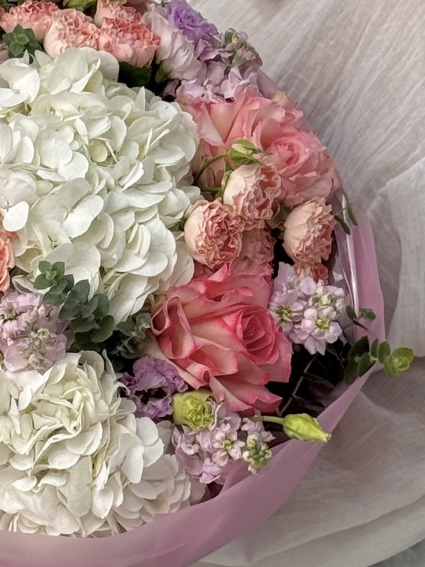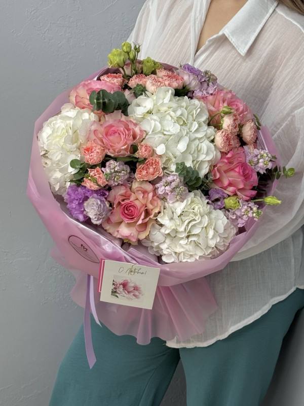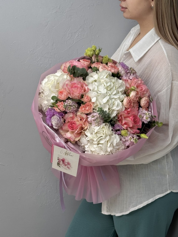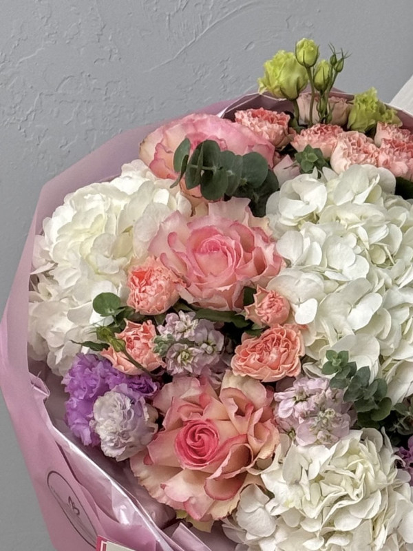 Букет с гортензией, французской розой,эустомой и кустовой розой. Нежная гортензия придает букету воздушность и объем, французская роза - изысканную элегантность, эустома - легкость и утонченность, а кустовая роза наполняет букет теплотой и уютом. Все цветы гармонично собраны в круглую упаковку, подчеркивающую мягкость и романтичный характер букета. Идеальный выбор для признания в чувствах, поздравления с особым событием или просто для того, чтобы подарить нежность