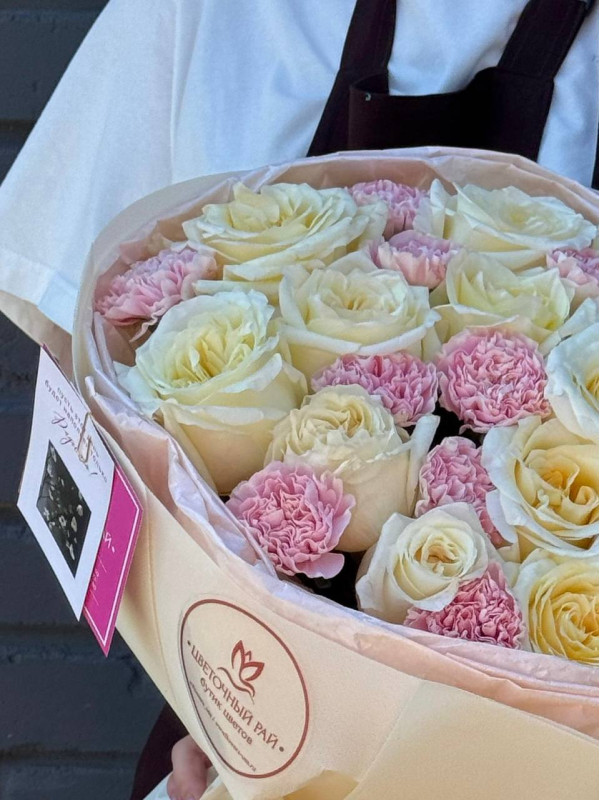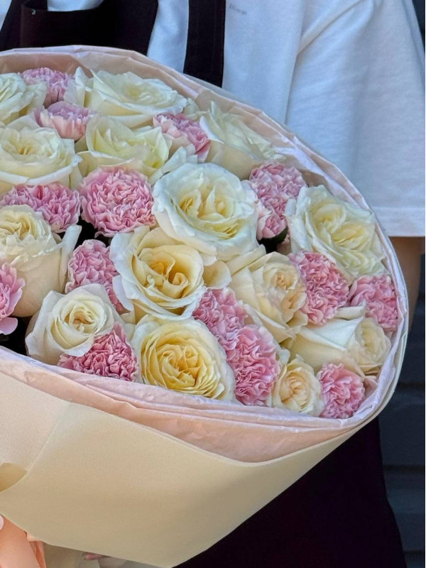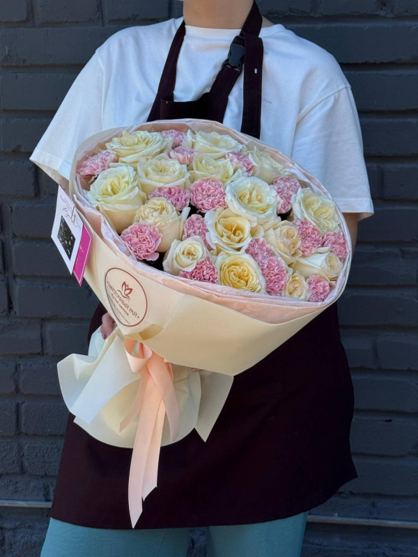 Соответствие образцу: на фото представлен пример букета. А каждый букет индивидуален и повторить его в точности практически невозможно. Так как цветы-это живой материал, они могут приходить к нам в разной степени раскрытия и пышности, формы и даже оттенка. Просим отнестись к этому с пониманием.