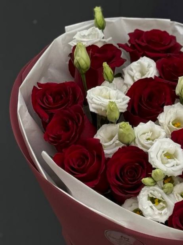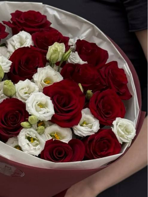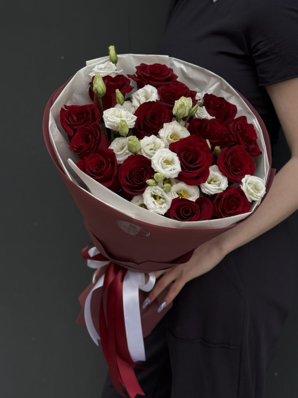 Букет страсти и утончённости: алые розы в обрамлении стойких эустом, собранные в элегантную упаковку.