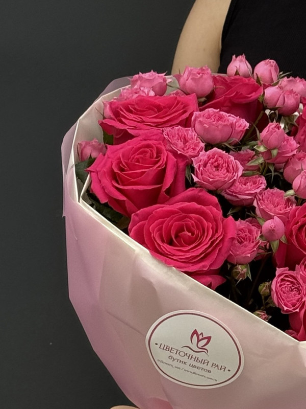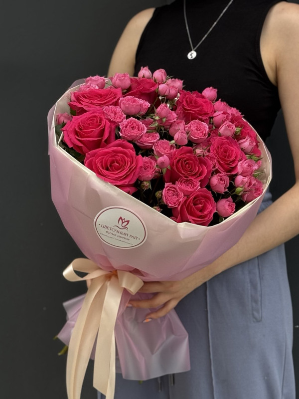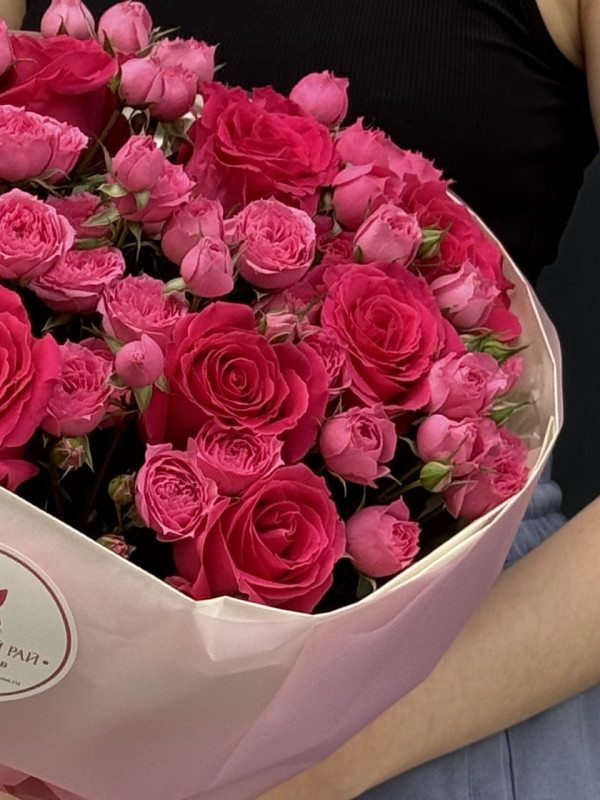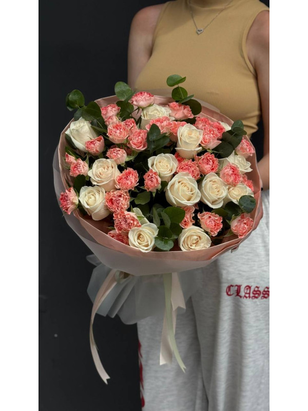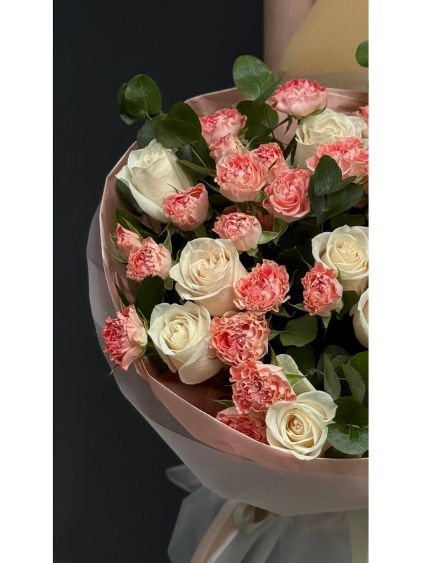 Нежность и романтика в каждой детали. Этот утончённый букет из кустовых и пионовидных роз создан, чтобы дарить эмоции. Многослойные лепестки, пышные формы и насыщенный аромат создают ощущение уюта, любви и красоты. Цветы бережно собраны в стильную круглую упаковку, подчёркивающую их естественную грацию.