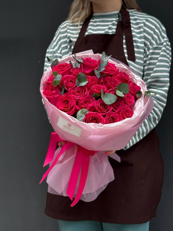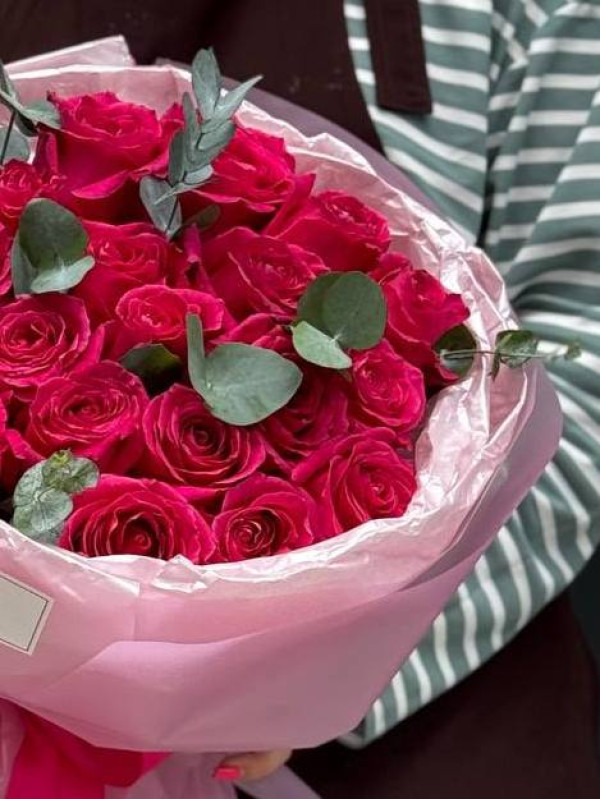 Букет из 25 эквадорских роз с добавлением зелени, оформленный в стильную упаковку по кругу. Возможно исполнение в одном цвете или микс.