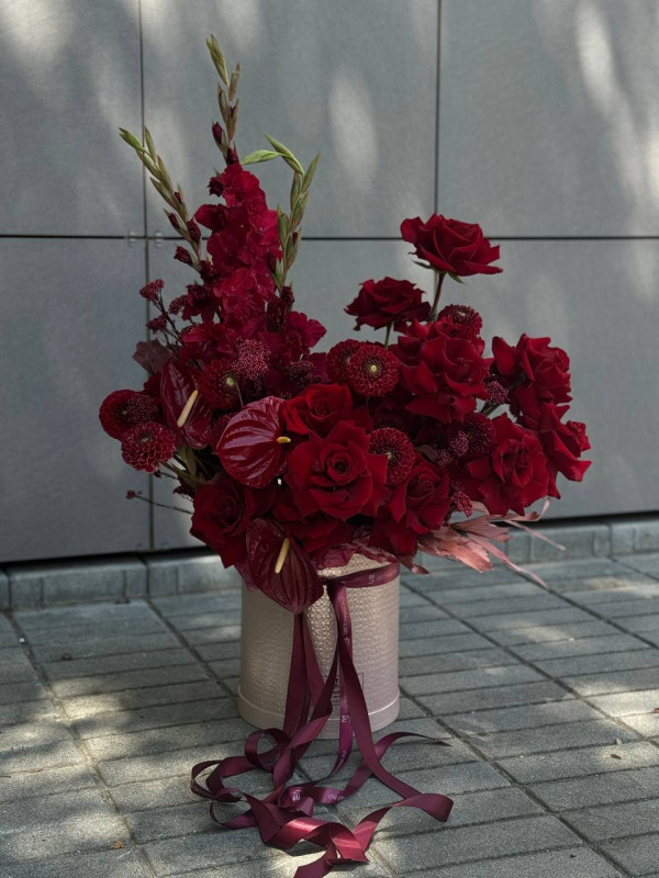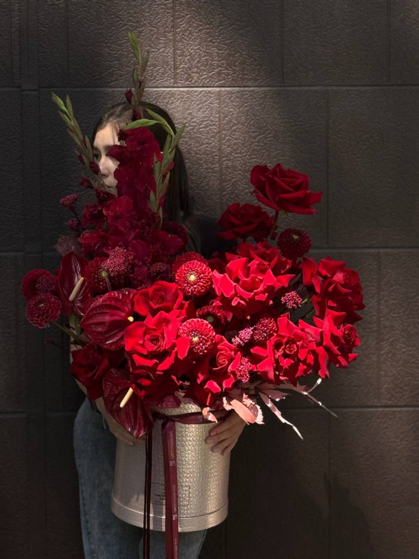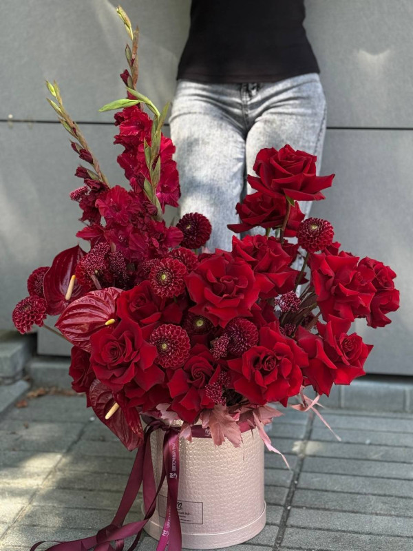 Страсть, изящество и летнее вдохновение - всё это в нашей композиции в коробке. Бархатистые французские розы, утончённый антуриум и роскошные сезонные гладиолусы с георгинами создают гармонию ярких красок и чувственности. Идеальный подарок, чтобы выразить любовь, восхищение или признательность.