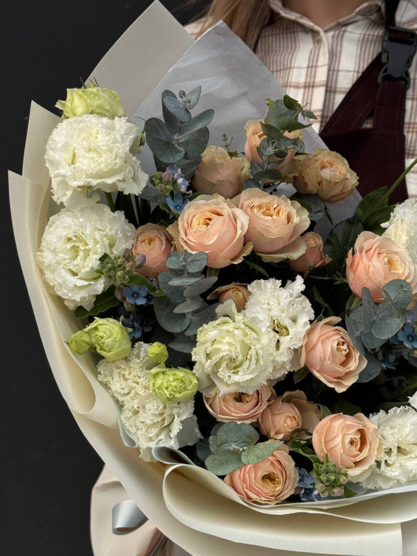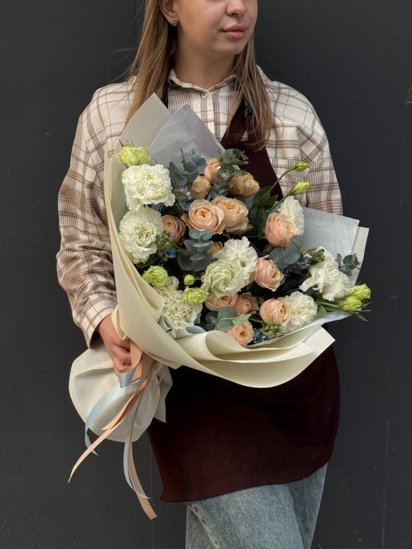 В составе букета есть сезонные цветы, вне сезона цветок может быть заменен на другой, похожий по фактуре и цвету.