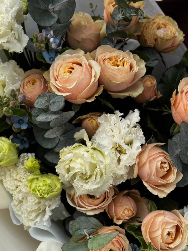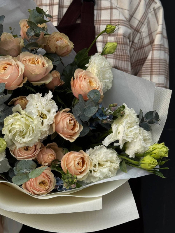Дуо букет из нежной эустомы и ароматной кустовой розы.