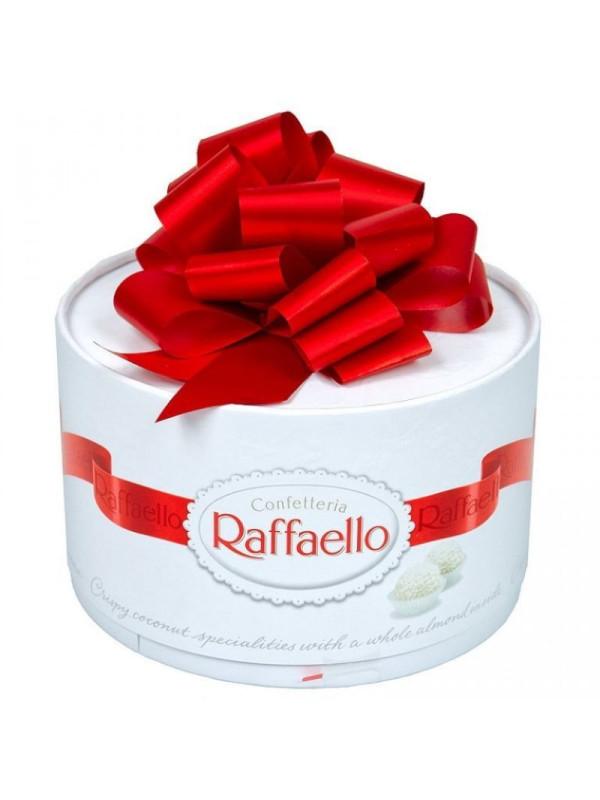 Дополните ваш букет цветов изысканным и необычным подарком – конфетами Raffaello в виде мини-тортика весом 200 грамм.