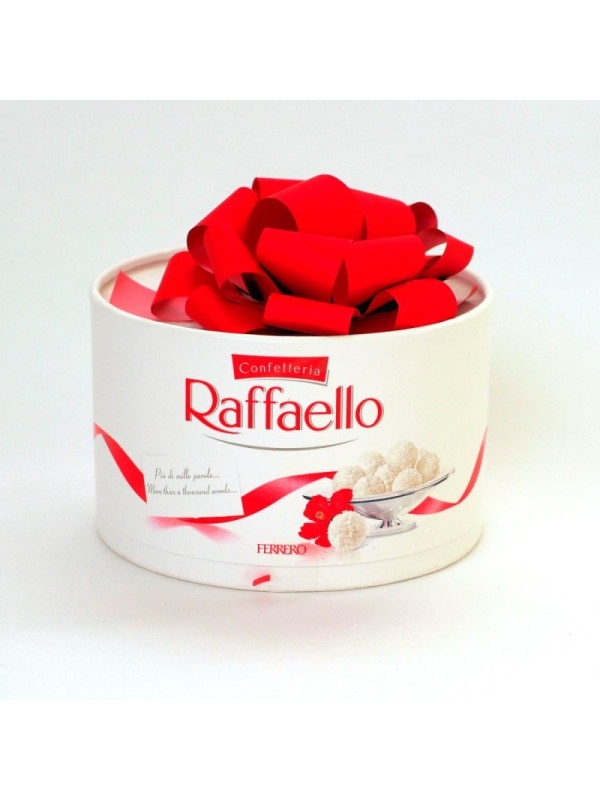 Дополните ваш букет цветов изысканным и необычным подарком – конфетами Raffaello в виде мини-тортика весом 200 грамм.