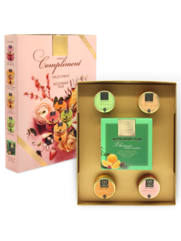 Приятный подарок на любой повод или дополнение к букету цветов. Набор для прекрасных дам, в который входят 4 вида мёда-суфле и листовой чай