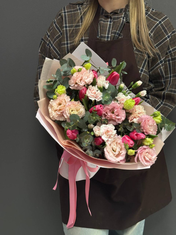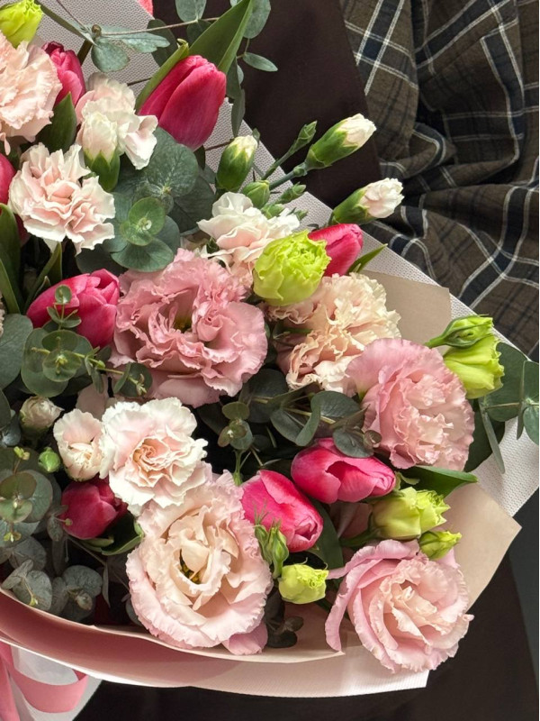 Нежный весенний букет из тюльпанов, эустомы, диантусов и эвкалипта - отличный подарок к 8 Марта. Лёгкий, воздушный букет оформлен в брендированную упаковку и полностью готов к вручению. Идеально подойдёт, чтобы выразить заботу, внимание и тёплые чувства.