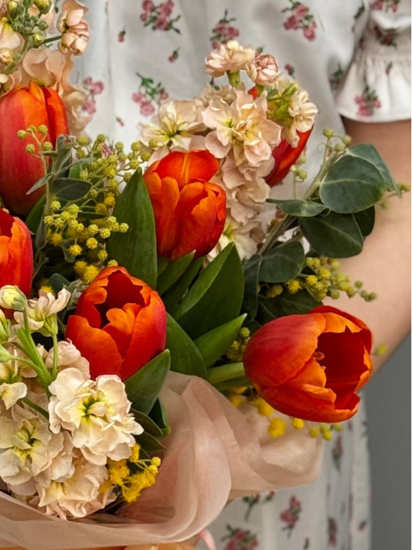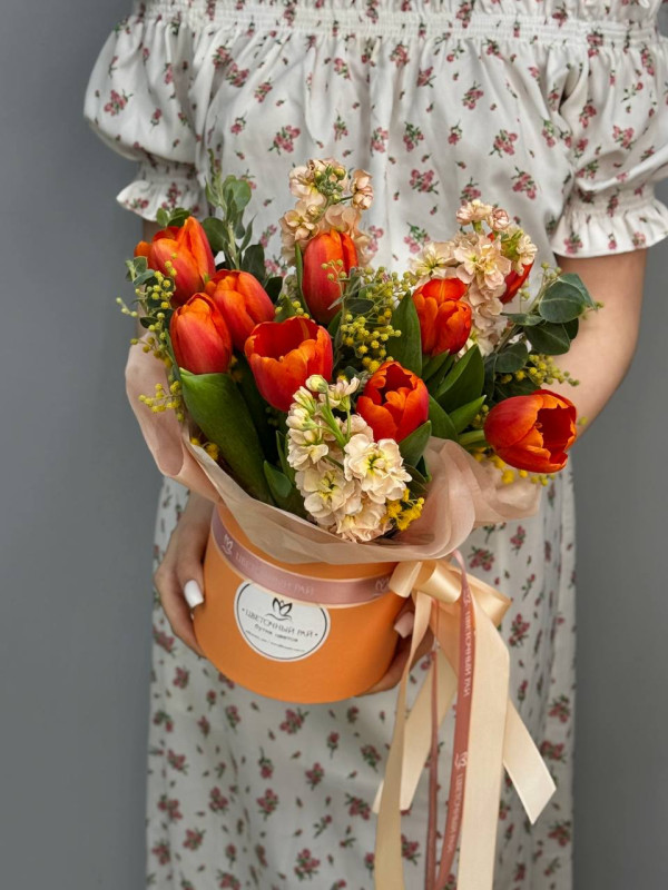 Ароматная композиция в коробке с тюльпанами,маттиолой и мимозой. Идеальный подарок для поднятия весеннего настроения.