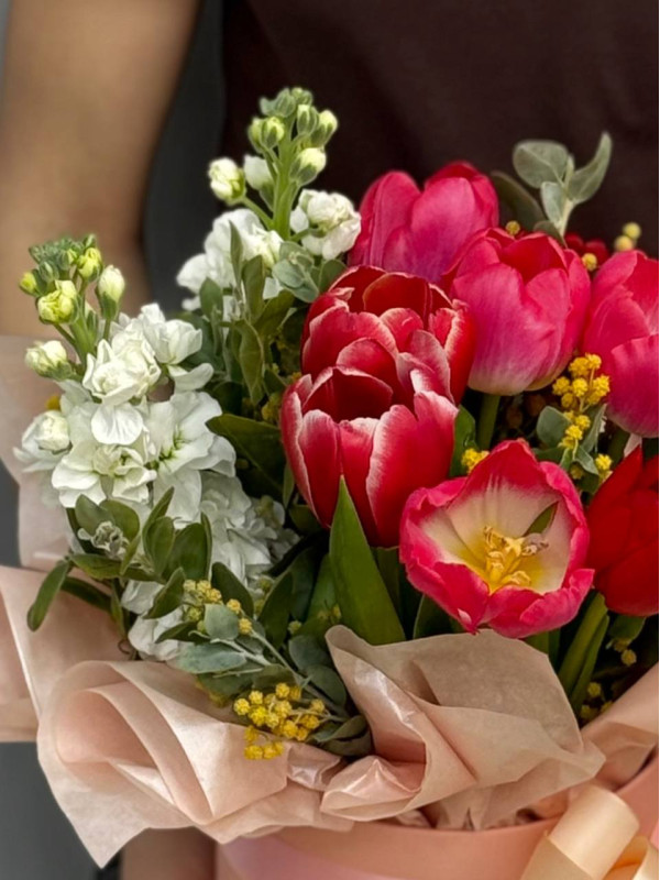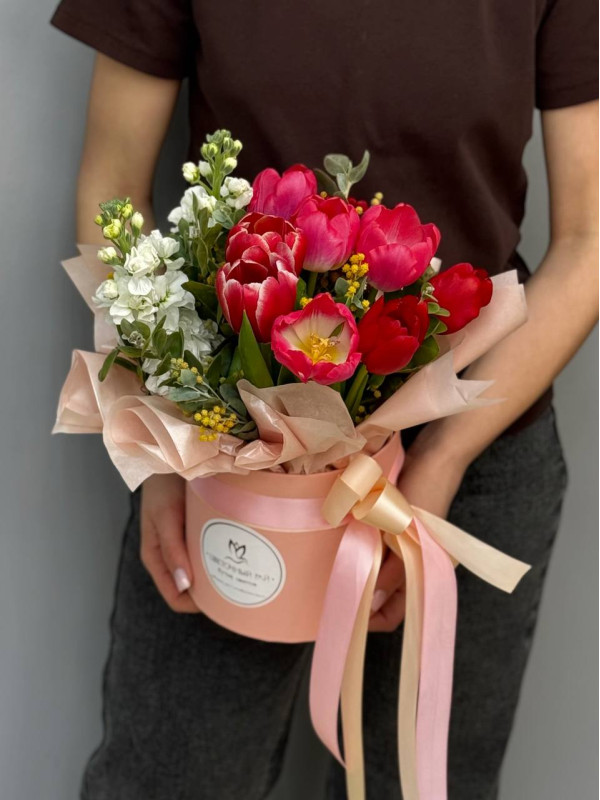 Ароматная композиция в коробке с тюльпанами,маттиолой и мимозой. Идеальный подарок для поднятия весеннего настроения.