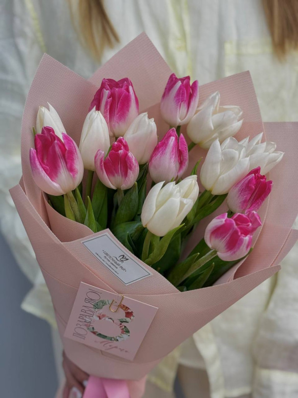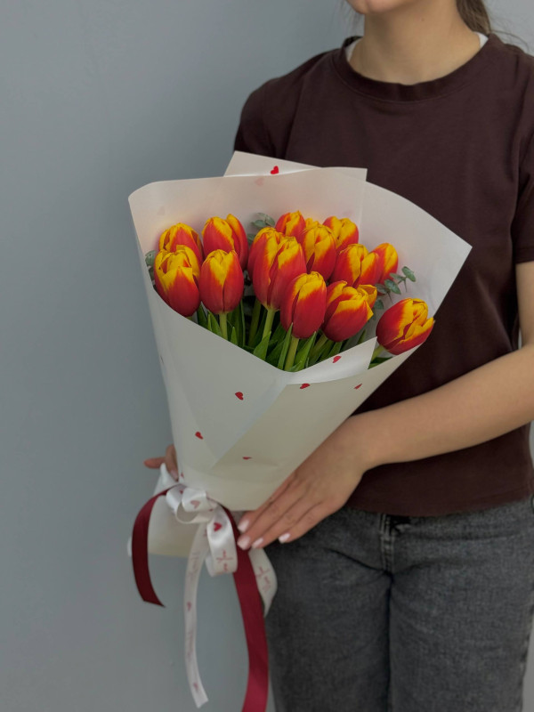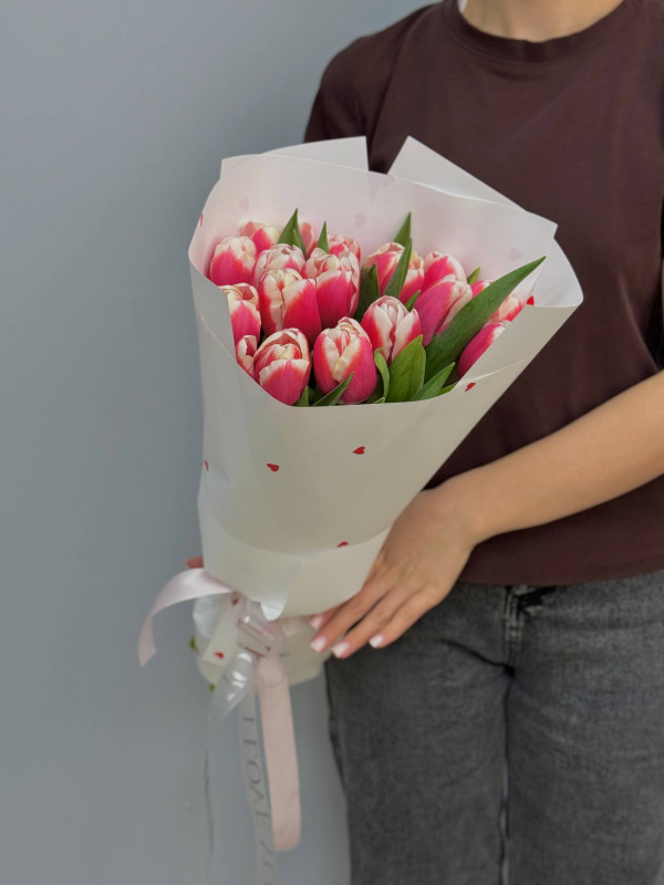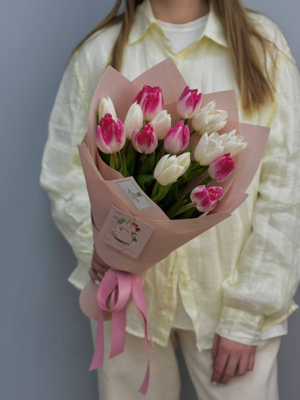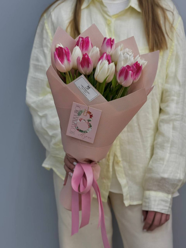 15 классических тюльпанов в красивой упаковке. Цвета на выбор из наличия, нежные или яркие