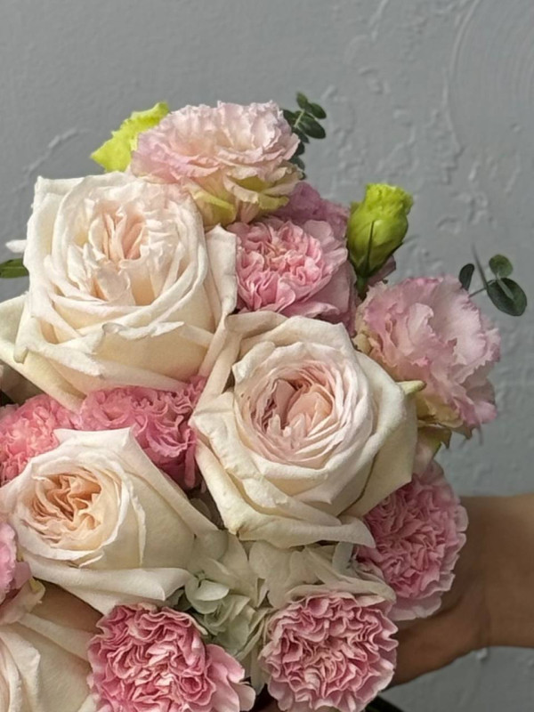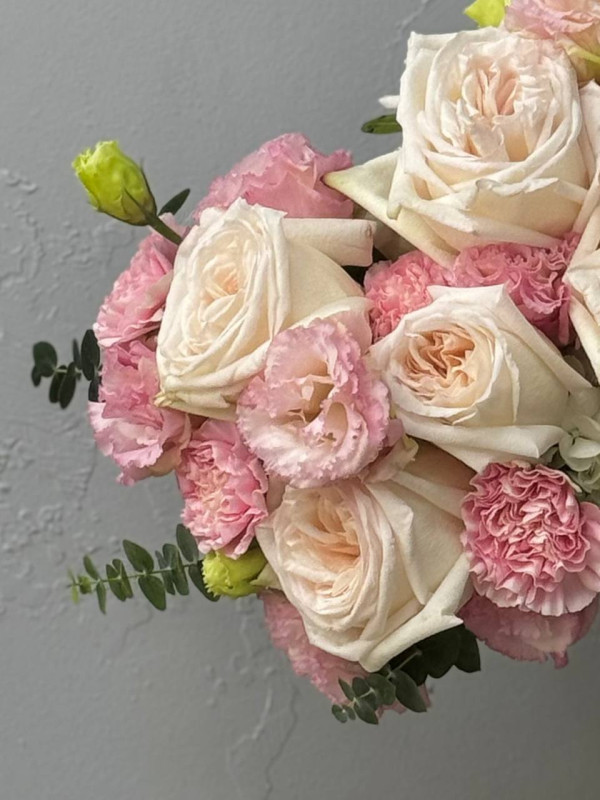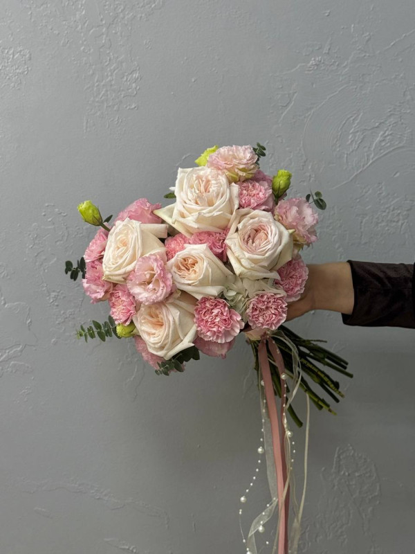 Этот воздушный свадебный букет словно соткан из самой нежности. Пышные пионовидные розы, трепетные эустомы и изящные гвоздики в нежно-розовой палитре создают образ утонченной романтики и чистоты чувств. Каждый цветок здесь - как легкое прикосновение, как взволнованный вздох перед важным "Да".