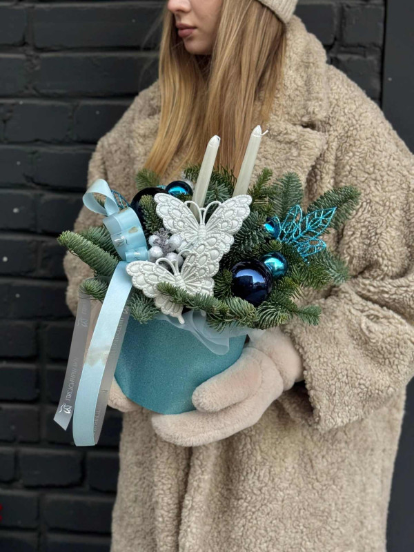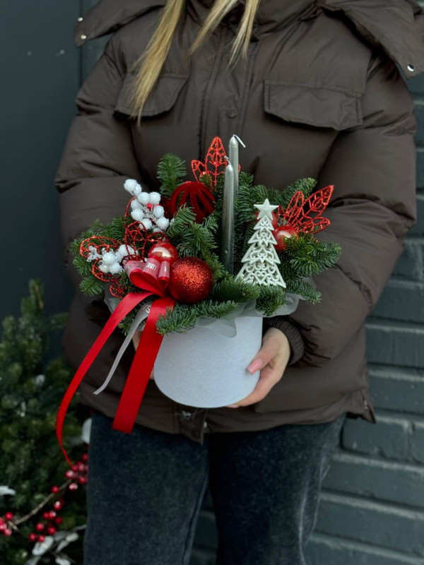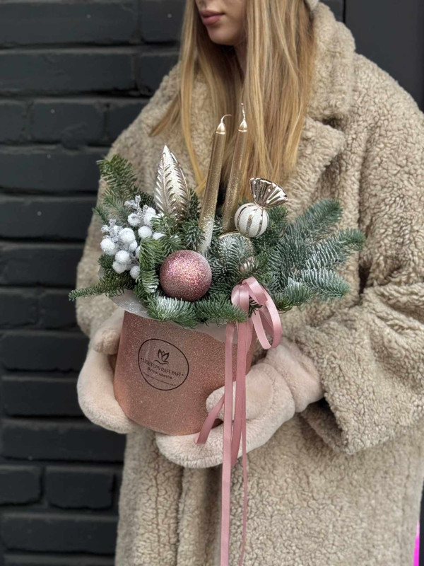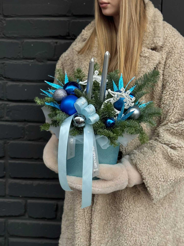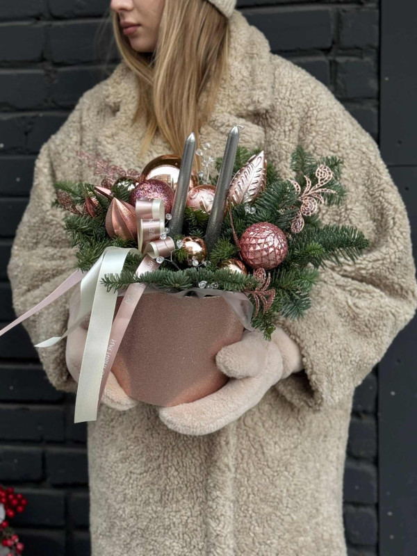 Украшения в композиции могут отличаться и подбираться индивидуально. Мы используем шары разных размеров, шишки, фигурки, декоративные ягоды, свечи, гирлянды и другие элементы, чтобы каждая работа выглядела гармонично и уникально.