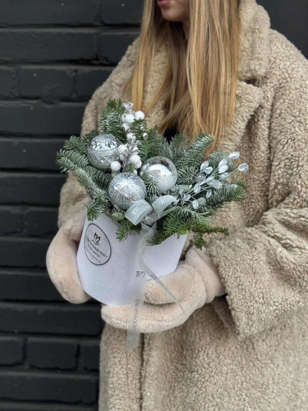 Композиция из свежего нобилиса в коробке - стильное новогоднее украшение, которое создаст атмосферу уюта и настоящего зимнего праздника. Нобилис славится своей высокой стойкостью: он долго сохраняет насыщенный зелёный цвет, не осыпается и остаётся свежим на протяжении всего новогоднего сезона. Хвоинки плотные, упругие, с характерным приятным хвойным ароматом, который делает композицию особенно тёплой и праздничной.