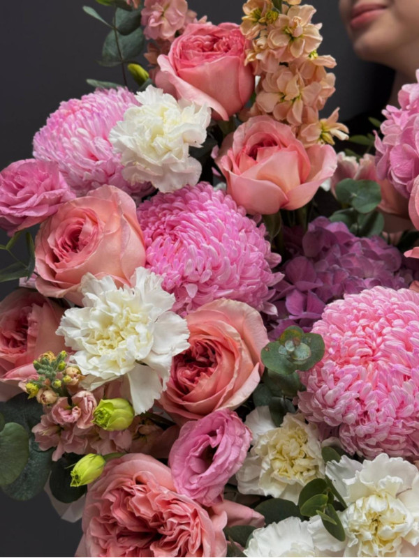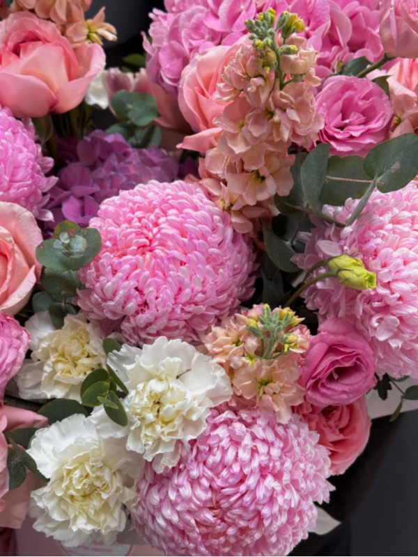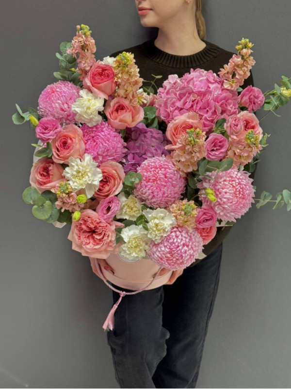 Эта изысканная цветочная композиция в стильной коробке сочетает в себе нежность и выразительность. Воздушная гортензия создаёт объём и мягкий фон, ароматная маттиола наполняет букет утончённым благоуханием, хризантемы добавляют фактурности и стойкости, а розы становятся элегантным акцентом, подчёркивающим романтичное настроение композиции. Гармоничное сочетание оттенков и текстур делает эту коробку прекрасным подарком для особых случаев - от признания в чувствах до поздравления с важным событием.