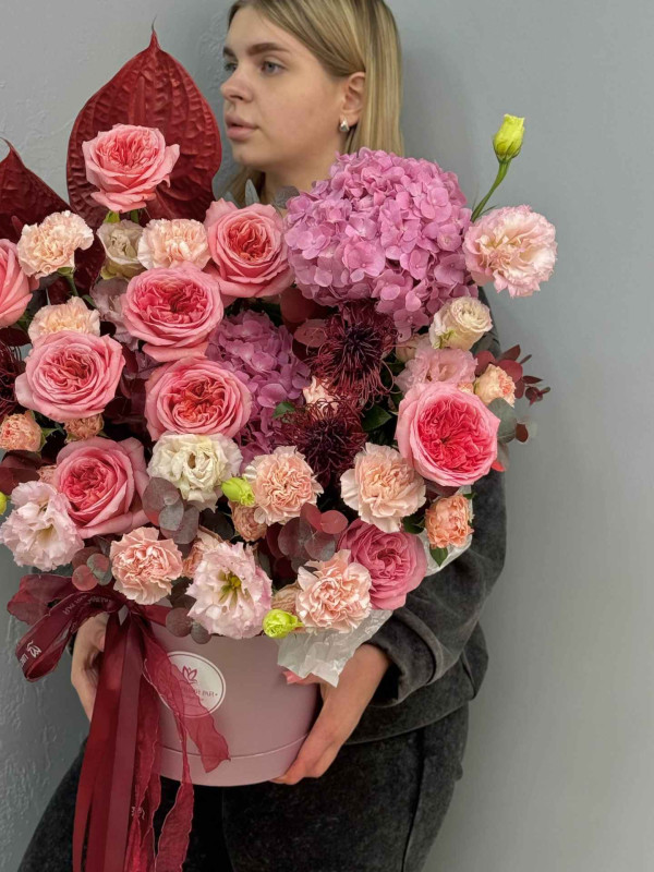 Выразительная композиция в коробке, где каждый цветок дополняет другой, создавая гармонию формы и оттенков. Экзотический антуриум придает образу характер и изысканный акцент. Воздушная гортензия наполняет композицию объёмом и мягкостью, роза Pink Expression раскрывается благородной элегантностью и романтичным настроением, а изящный нутан завершает образ, подчёркивая природную утончённость и современный стиль композиции. Идеальный выбор для стильного подарка, который говорит о чувствах без слов и дарит эстетическое удовольствие с первого взгляда.